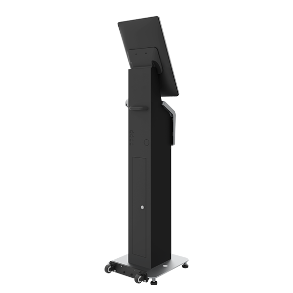 El diseño compacto del Alfred-HE se adapta a entornos donde el espacio es limitado. Puede configurarse con soporte de suelo o de mostrador, y también admite montaje en pared VESA. El quiosco puede instalarse tanto en orientación vertical como horizontal, lo que permite ajustarlo a las necesidades específicas de cada espacio sanitario.
