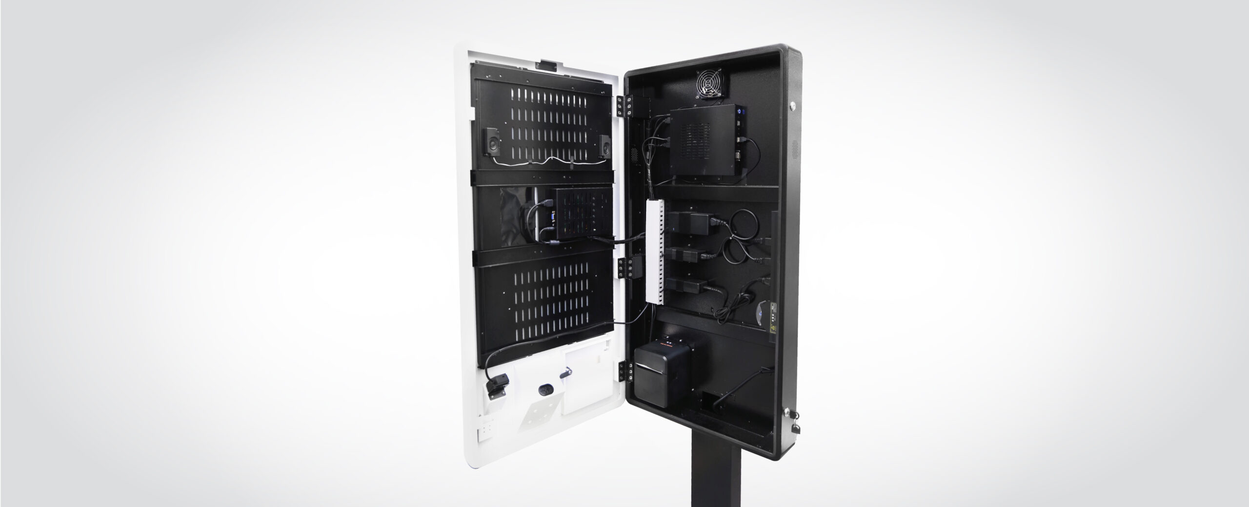Incluye ventilador de enfriamiento de alta velocidad para mantener un rendimiento estable bajo uso continuo, acceso rápido al interior del kiosco para mantenimiento eficiente, caja de sistema extraíble y conectividad WiFi y Bluetooth. También incorpora altavoz integrado para notificaciones y experiencia interactiva mejorada.